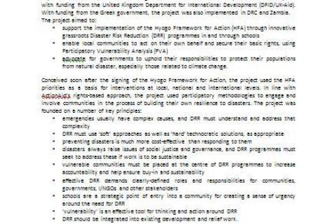 This executive summary outlines the findings of a learning review on ActionAid's 5 year Disaster Risk Reduction through Schools (DRRS) project, implemented in 9 countries across Africa, Asia and the Americas.  The summary gives an overview of the project's approaches and methodologies, and outlines key factors for successful and sustainable DRR initiatives.